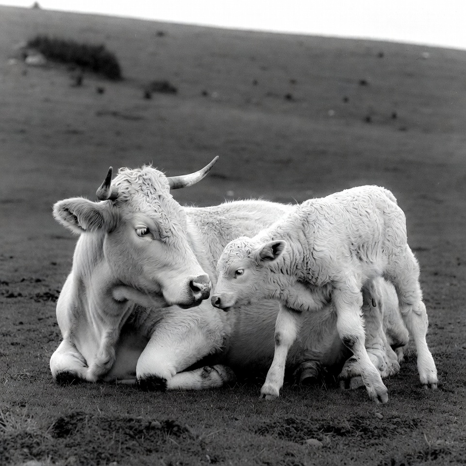 A mother cow with horns lies on grassy terrain, nuzzling her young white calf. The calf stands close beside her, both captured in a black and white photograph. They are set against a hilly, open landscape with sparse vegetation.