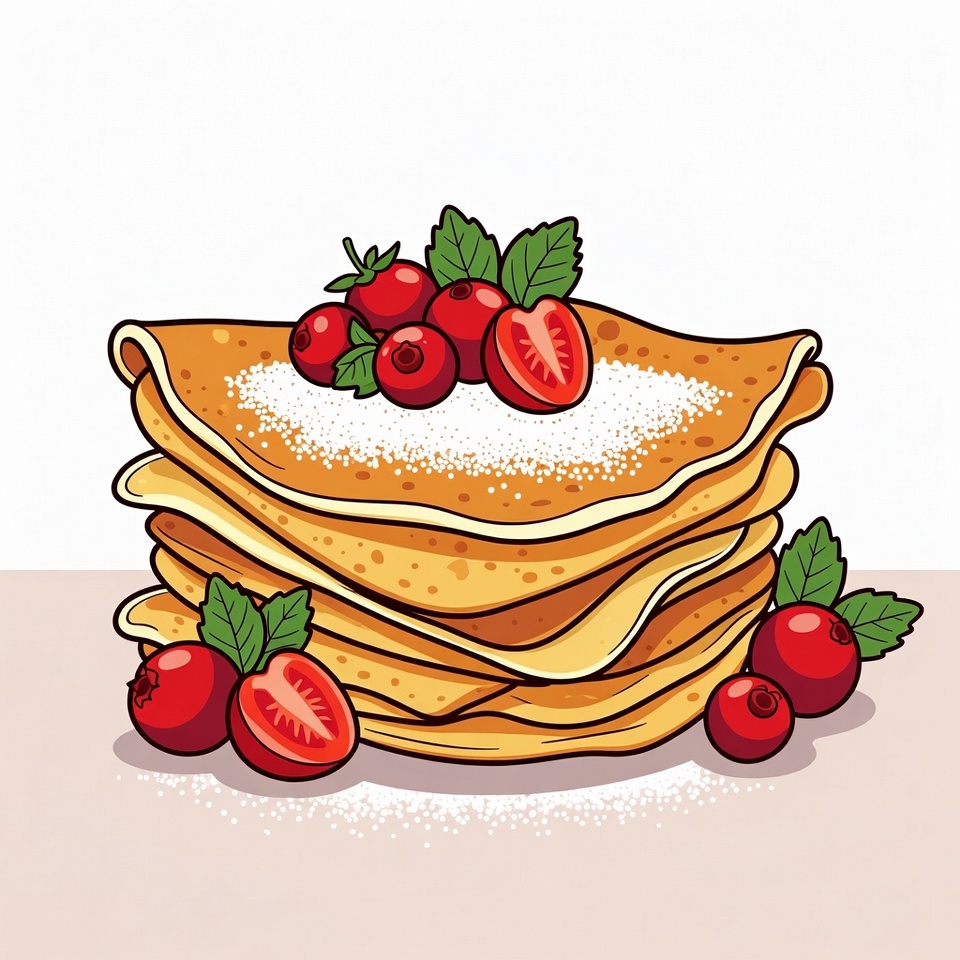 berry topping, blini, breakfast, cartoon food, clipart, crepes, delicious, dessert, food, fresh fruit, gourmet, green leaves, illustration, isolated background, powdered sugar, red berries, stack, stackable pancakes, sweet, pancakes