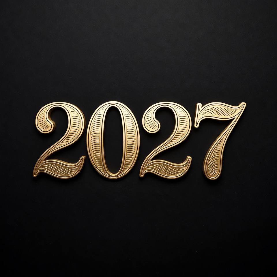 The number 2027 is rendered in elegant gold with ornate, wavy edges and a metallic 3D effect. It is centered against a solid black background, creating a striking contrast. The design features intricate line details for a luxurious appearance.