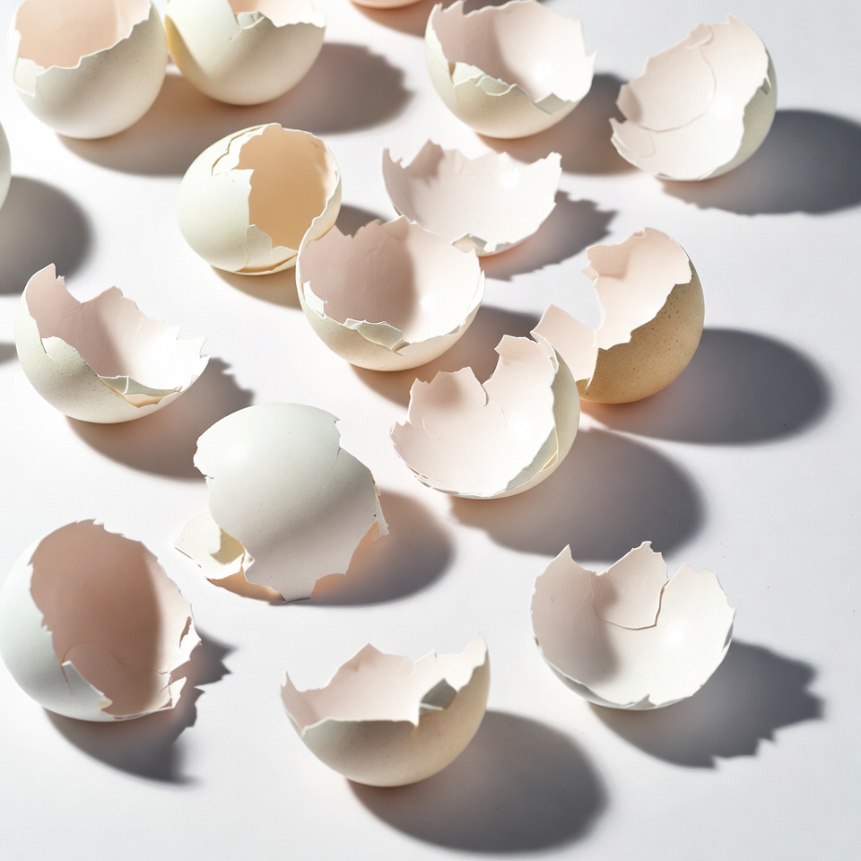 Multiple broken egg shells are scattered across a plain white surface. The shells are pale white with jagged cracks and openings, casting soft shadows from overhead lighting. They are arranged in a loose, natural cluster.