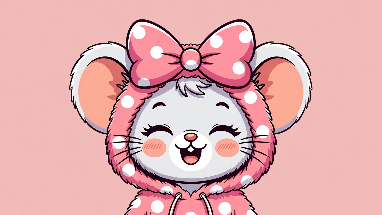 A kawaii cartoon mouse with white fur and large sparkling eyes wears a pink hoodie and oversized pink bow. The mouse has rosy cheeks, a happy smile, and fluffy ears poking out from the hood. It is centered against a solid pink background.