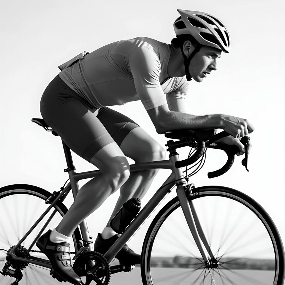 A man wearing a helmet and cycling jersey leans forward on a road bike in a dynamic riding pose. He grips the aero bars with focused determination, dressed in tight shorts and shoes. The black and white image captures his muscular legs pedaling on a sleek bicycle with thin wheels.