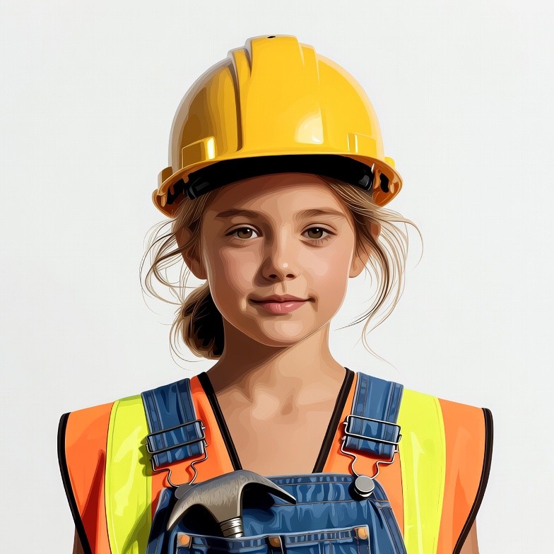 A young girl with light brown hair in a ponytail wears a yellow hard hat and holds a hammer in front of her chest. She is dressed in blue denim overalls over an orange high-visibility vest. The image is a digital illustration against a white background.