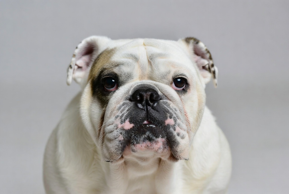adorable dog, animal, big eyes, black nose, brown markings, bulldog, canine, close-up, cute bulldog, dog, dog face, dog portrait, gray background, pet, puppy, purebred dog, white dog, wrinkled face, English bulldog
