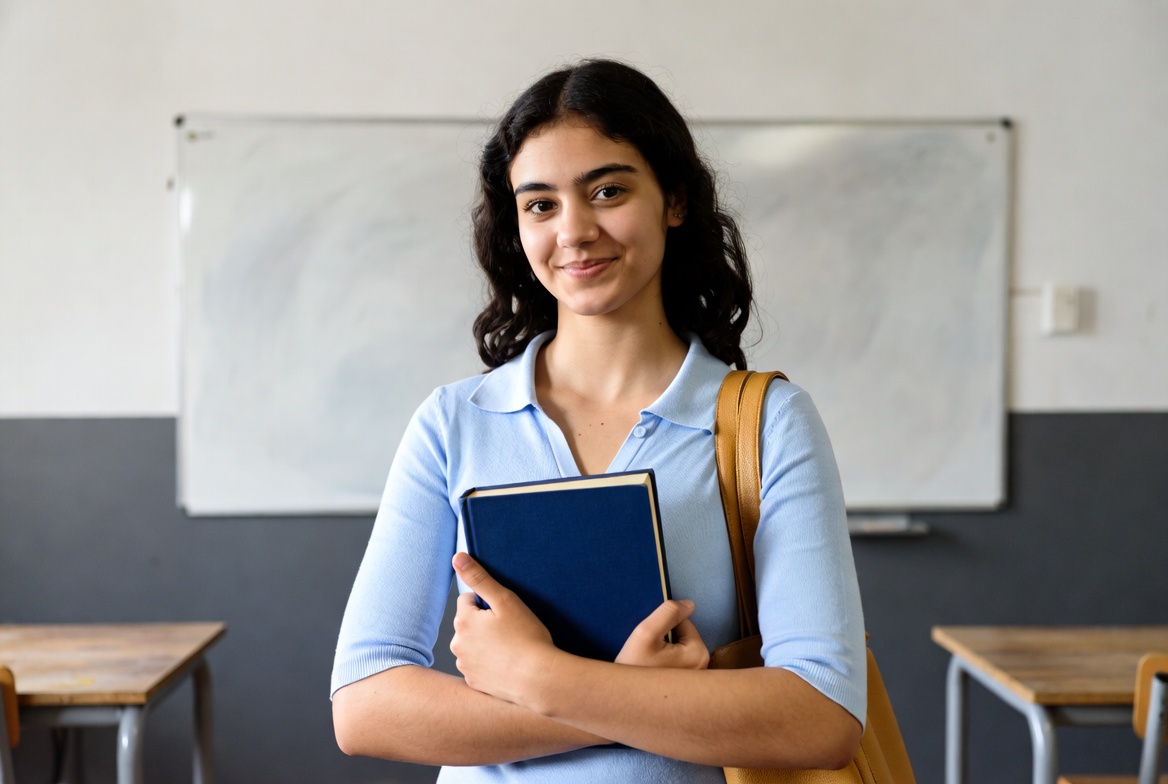 A young woman with dark wavy hair smiles at the camera while holding a blue notebook against her chest in a classroom. She wears a light blue collared shirt and a brown leather shoulder bag. She stands in front of a large white whiteboard with wooden desks on either side.