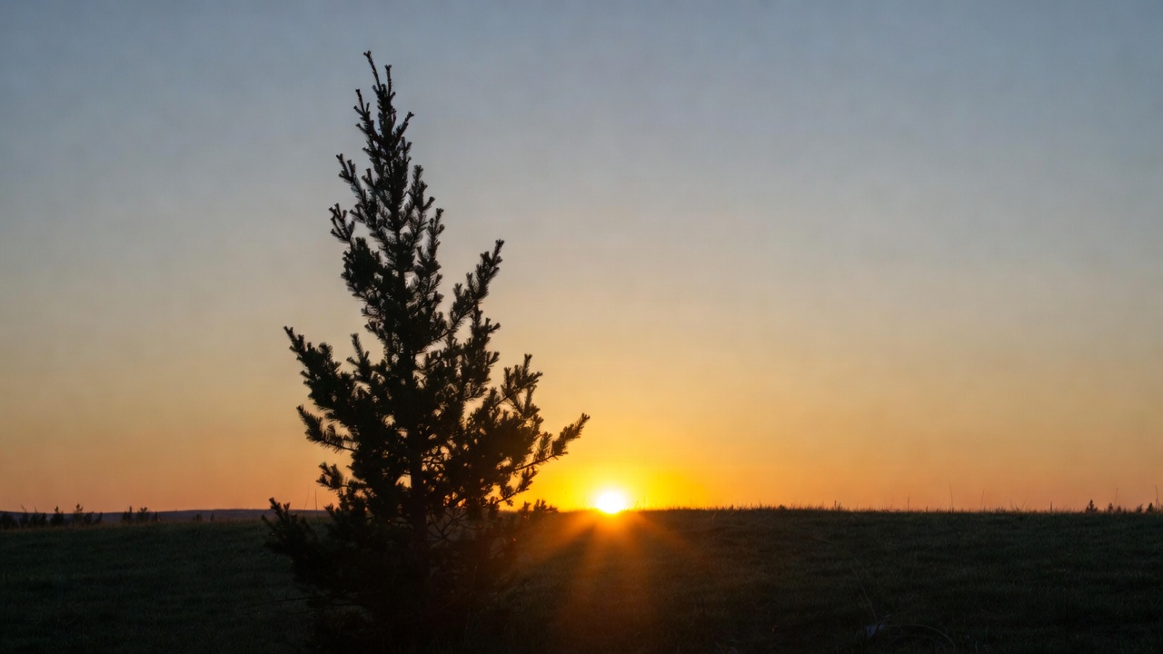 A lone pine tree stands in silhouette against a vibrant orange and purple sunset sky. The sun glows brightly on the horizon, casting rays over a flat grassy field. The scene features a clear horizon with no other elements visible.