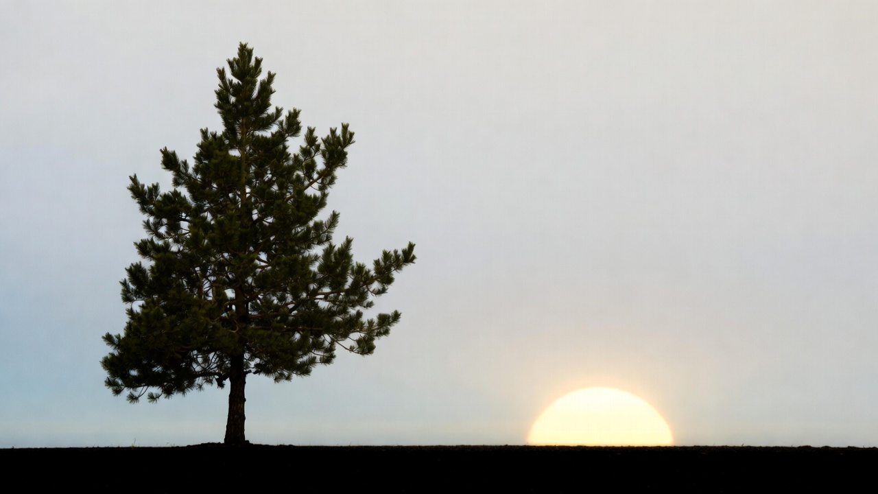 A lone pine tree stands silhouetted on a dark ground with the sun rising directly behind it. The sky features a gradient from light blue to warm orange hues around the glowing sun. The scene is captured in a minimalist landscape composition.