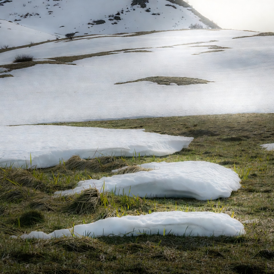 Snow patches of varying sizes cover a grassy slope in a mountainous landscape. Sunlight illuminates the white snow against the green grass and brown earth. Distant snow-covered peaks rise under a bright sky.