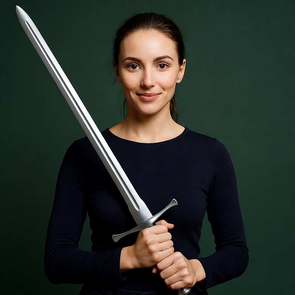 A smiling woman with dark hair in a ponytail holds a large silver sword with both hands in front of her chest. She wears a black long-sleeved top and stands against a solid green background. The sword features a pointed blade and ornate crossguard.
