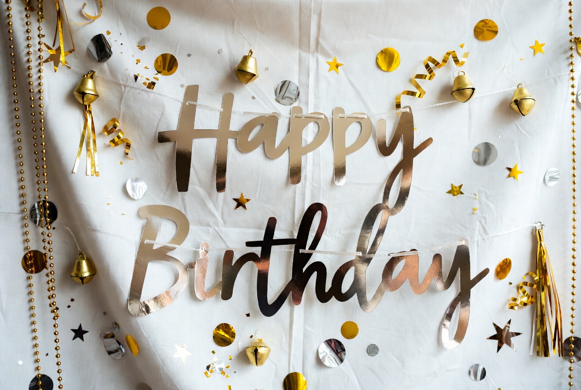 A shiny gold 'Happy Birthday' banner hangs against a white backdrop. It is decorated with gold confetti, stars, bells, and tassels scattered around. The festive elements create a celebratory party display.