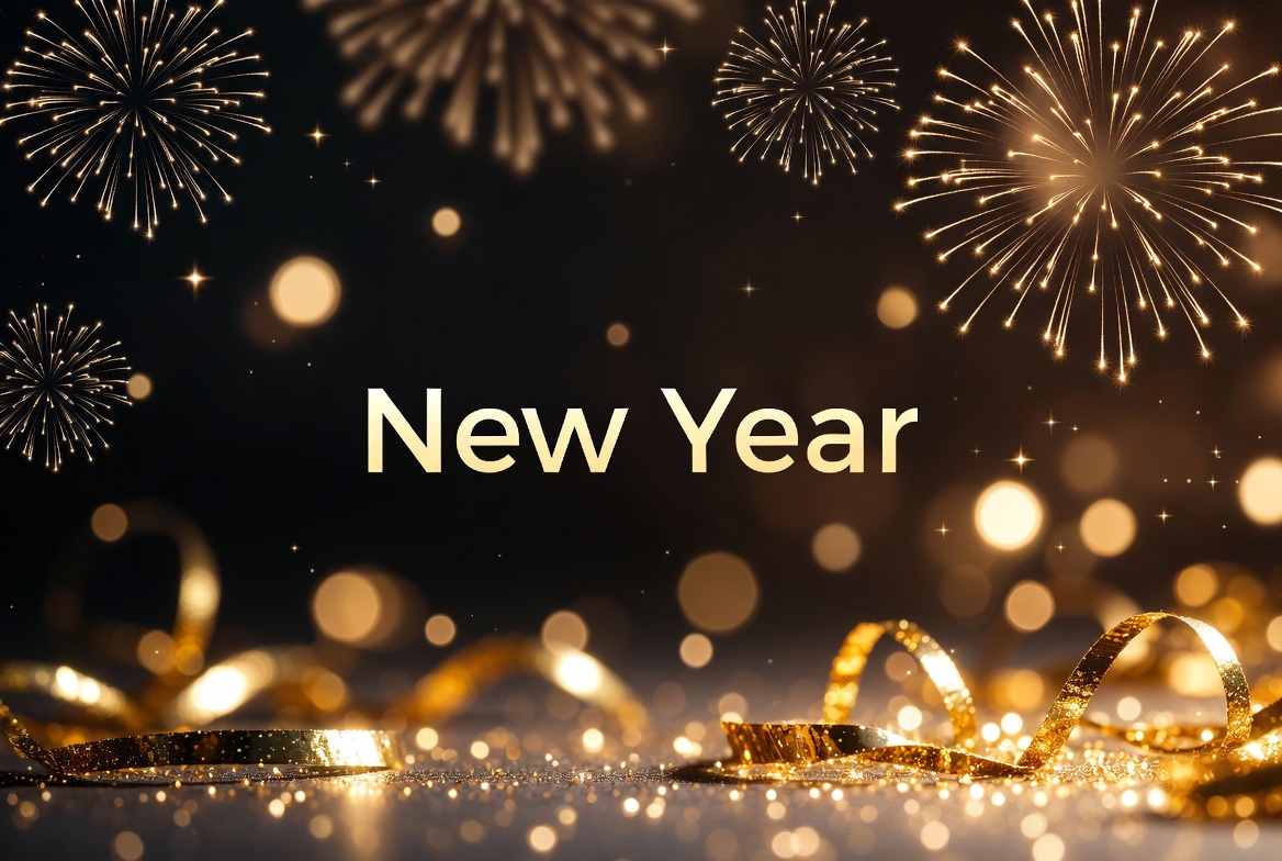 A festive New Year background features exploding golden fireworks against a dark starry sky. Shiny gold ribbons and confetti scatter across the bottom on a bokeh-lit surface. The text 'New Year' is prominently displayed in elegant golden lettering.