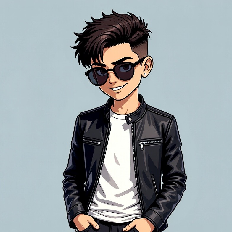 Asian, black jacket, boy, cartoon, confident pose, cool style, dark hair, hands in pockets, illustration, isolated background, leather jacket, male, smiling, spiky hair, sunglasses, undercut, white shirt, young boy, anime boy