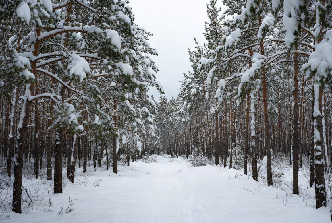 A snow-covered path winds through a dense forest of pine trees blanketed in white snow. The tall pines line both sides of the trail under a cloudy gray sky. Fresh snow dusts the ground and branches, creating a serene winter scene.
