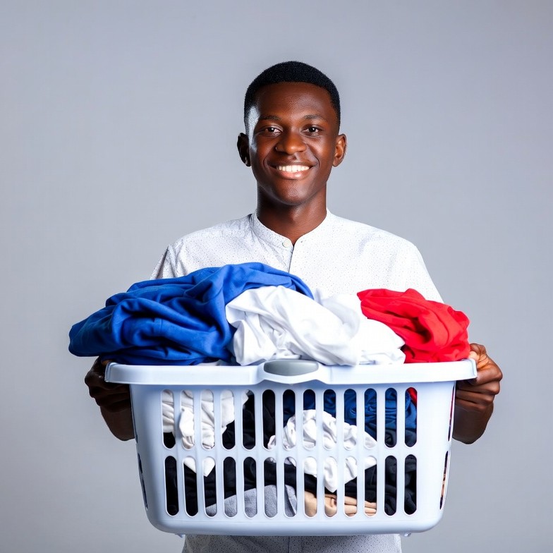 A smiling young African-American man with short hair holds a white plastic laundry basket overflowing with colorful clothes including blue, white, and red items. He wears a white shirt with blue accents and stands against a plain gray background. The basket features blue handles and is filled to the brim with folded and unfolded laundry.