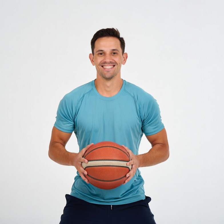 A smiling athletic man with short dark hair holds a basketball with both hands in front of his chest. He wears a light blue short-sleeved athletic shirt and dark pants, standing against a plain white background. His expression is friendly and confident.