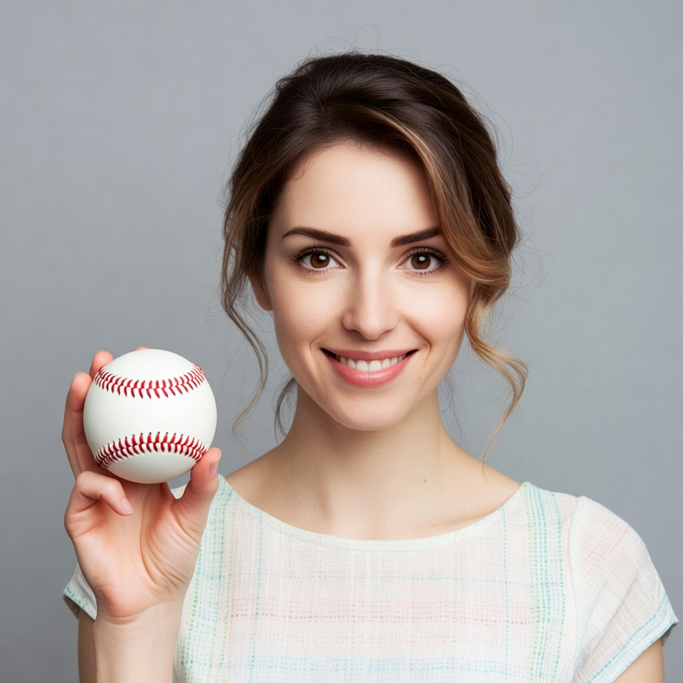 A young woman with brunette hair in an updo smiles while holding a white baseball with red stitching in her hand. She wears a light green checkered top and stands against a plain gray background. Her expression is cheerful with direct eye contact.