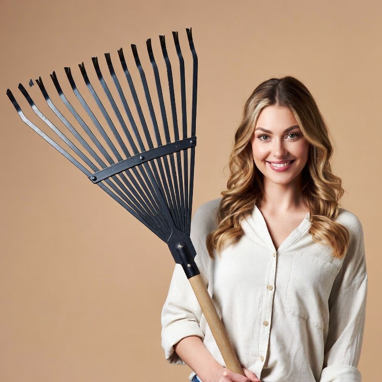 A smiling young woman with long wavy blonde hair holds a large black metal garden rake with a wooden handle. She wears a light beige button-up shirt and stands against a plain tan background. The rake is prominently displayed in front of her.