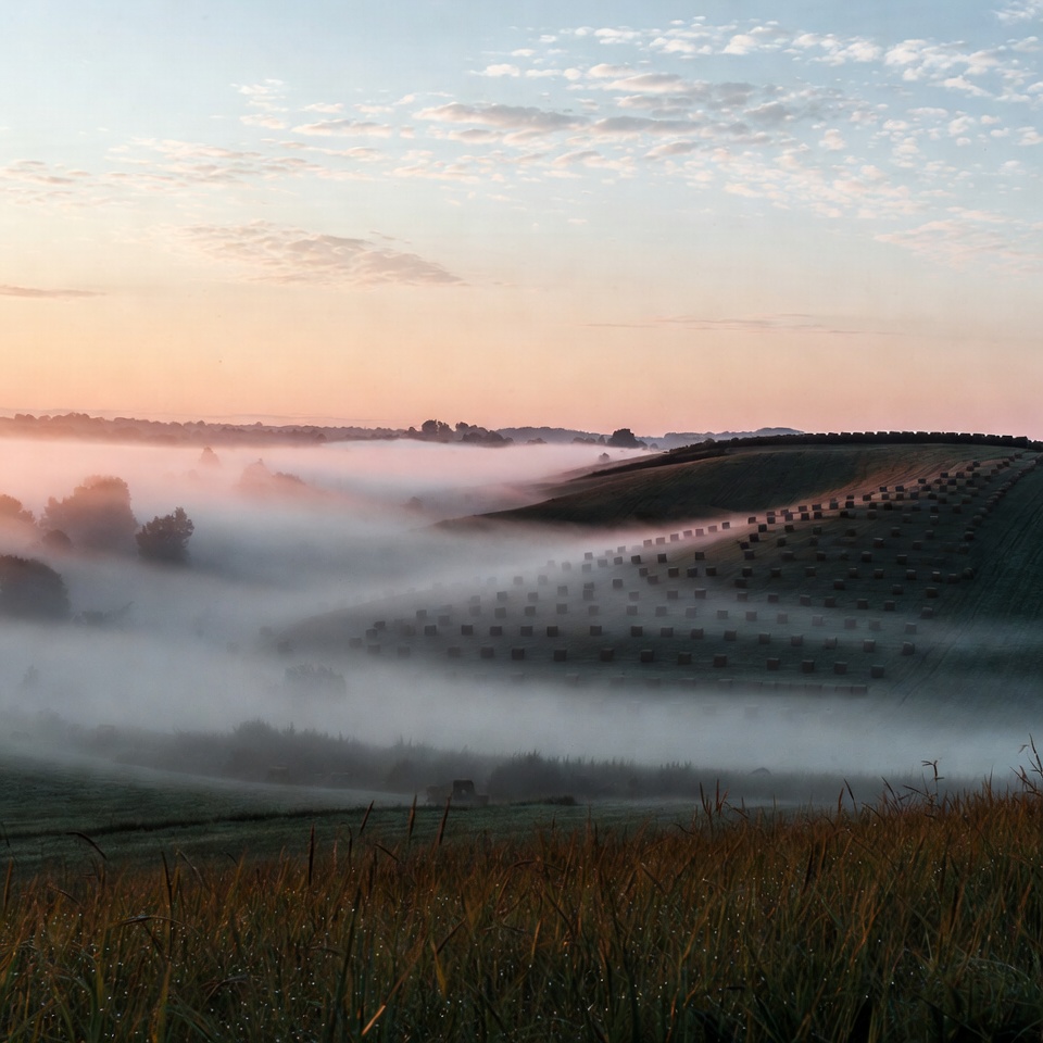 agriculture, clouds, countryside, dawn, farmland, fields, fog, foggy valley, golden light, grass, haystacks, landscape, mist, misty hills, morning mist, rolling hills, rural scenery, sunrise, trees, hay bales