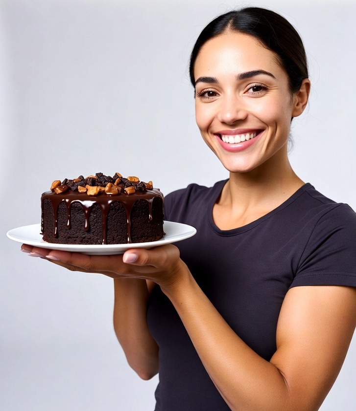 A smiling Latina woman with dark hair holds a chocolate cake topped with nuts and drizzled with ganache on a white plate. She wears a black t-shirt and stands against a white background. Her expression is joyful as she presents the dessert.