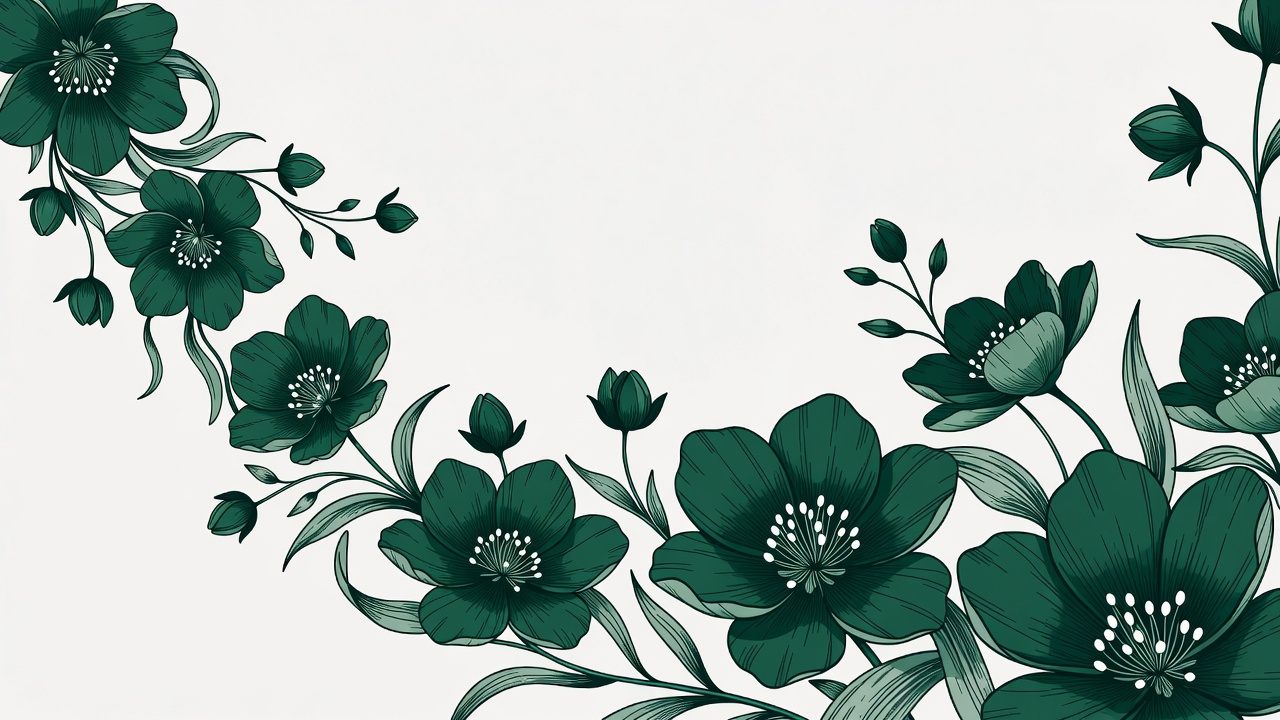 A digital illustration features a curving cluster of vibrant emerald green flowers with detailed petals and leaves. The flowers are arranged in an elegant arc against a plain white background. Fine line work adds texture to the buds and stems.