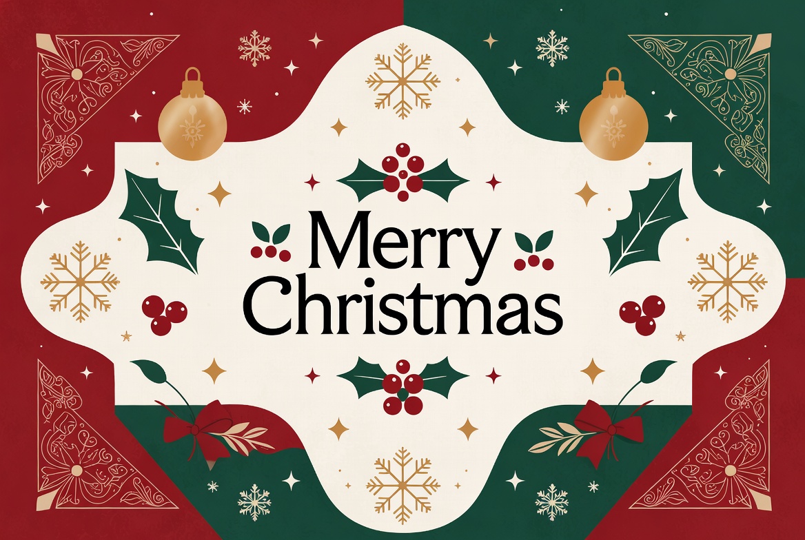 A festive Christmas greeting card illustration features 'Merry Christmas' text in elegant white font on a cream background. It is framed by ornate red and green borders with gold ornaments, holly leaves, red berries, snowflakes, and ribbon accents. The design uses a vibrant color palette of red, green, gold, and white.