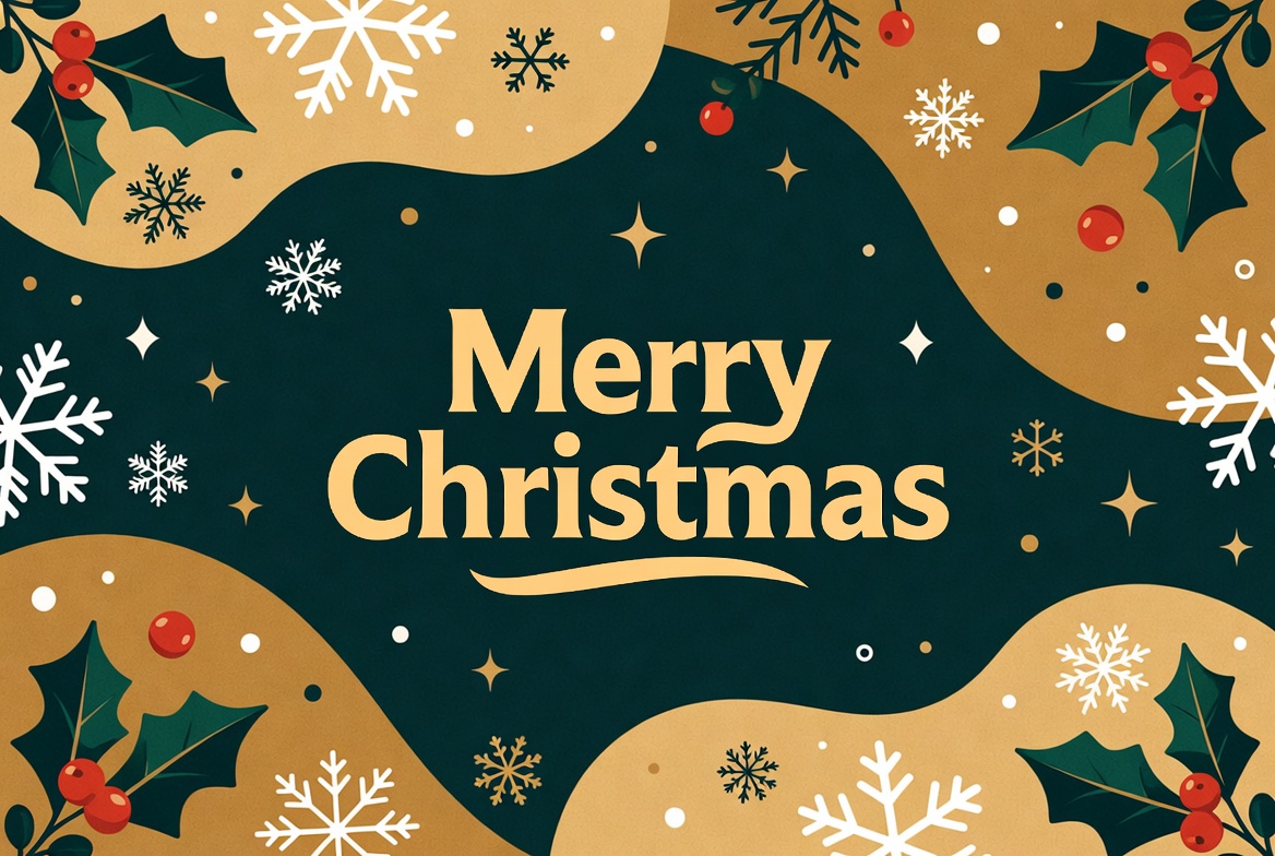 A vibrant digital illustration features the text 'Merry Christmas' in bold gold letters on a dark green background. Surrounding elements include white snowflakes, red holly berries, green holly leaves, gold stars, and wavy tan borders. The design has a festive holiday theme with no people present.