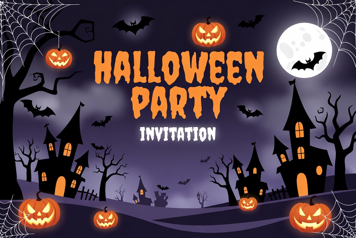 bats, clipart, dark background, festive, full moon, ghosts, gravestone, haunted castle, holiday, illustration, invitation, isolated background, jack-o-lantern, night sky, orange text, party, pumpkin, scary, spider webs, spooky, trees, Halloween