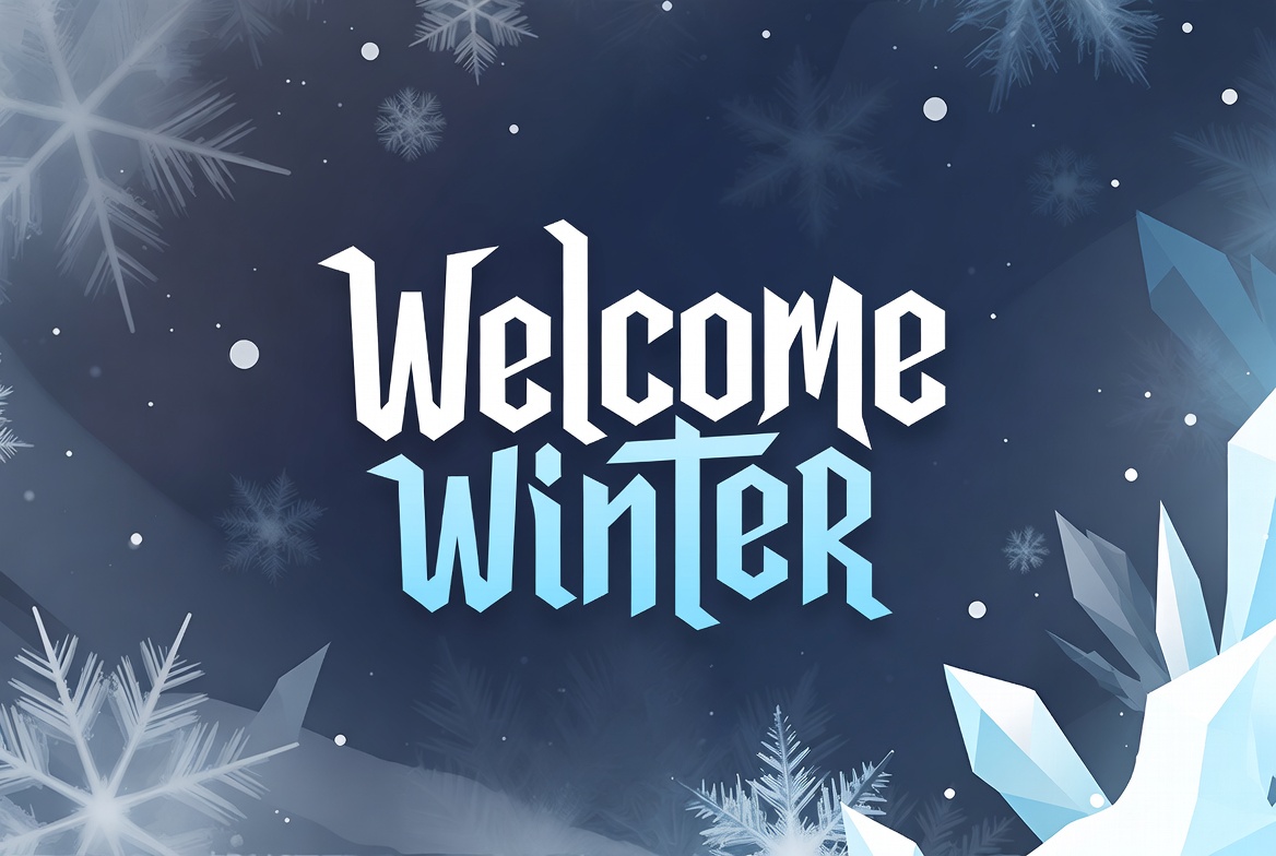 blue background, clipart, digital art, festive winter, gothic font, holiday graphic, ice crystals, icy background, illustration, isolated background, snow design, snowflakes, snowy background, white text, winter banner, winter design, winter illustration, winter text, welcome winter