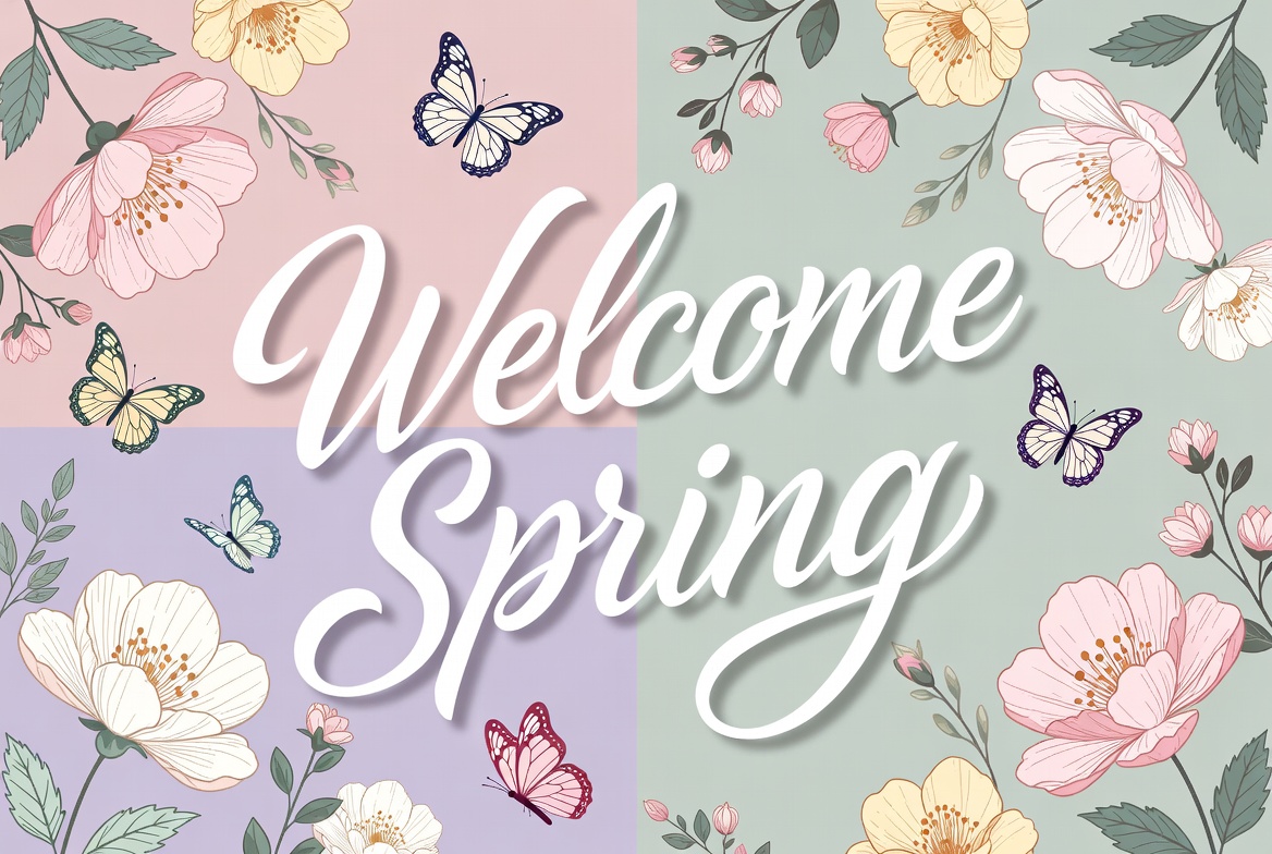 blue butterfly, butterflies, butterflies, clipart, cursive text, digital illustration, elegant font, floral design, flowers, garden illustration, green background, isolated background, pastel colors, pink background, pink flowers, purple background, seasonal graphic, soft gradients, spring flowers, spring greeting, vector art, welcome sign, white flowers, yellow background, yellow flowers, welcome spring