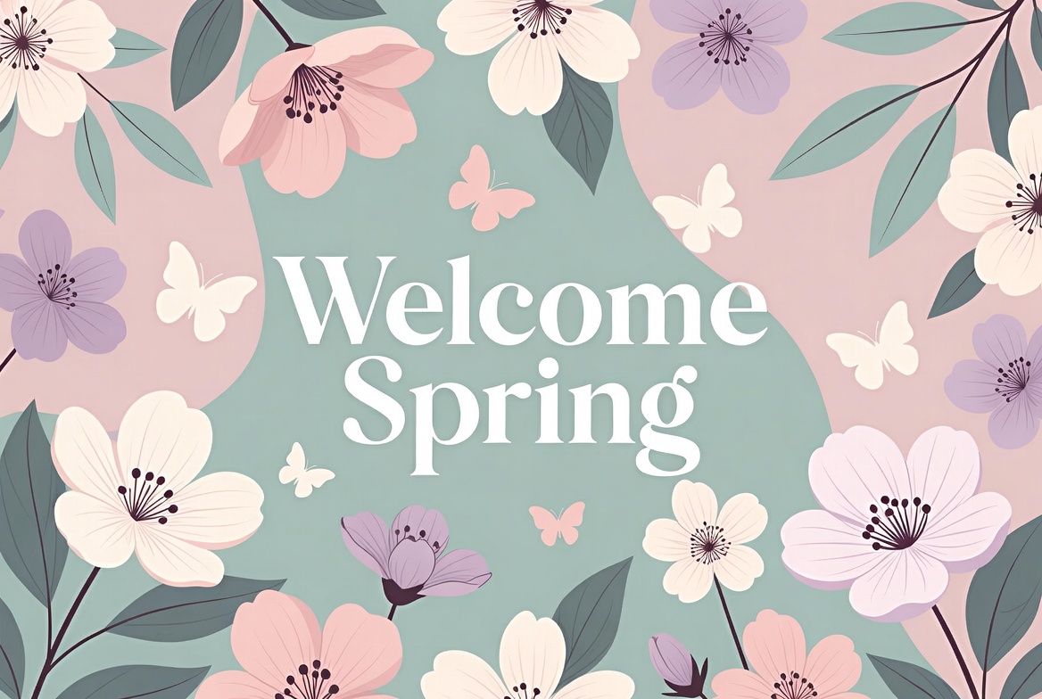 A vibrant illustration features the text 'Welcome Spring' in bold white letters on a pastel green background. Surrounding the text are clusters of pink, white, and purple flowers with green leaves and delicate white butterflies. The design uses soft pastel colors in a flat, vector art style.