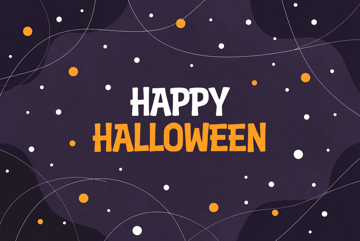 A vibrant illustration features the text 'Happy Halloween' in bold white and orange letters on a dark purple background. White and orange dots and curved lines create a festive, spooky atmosphere. The design is simple and graphic with no people or figures.