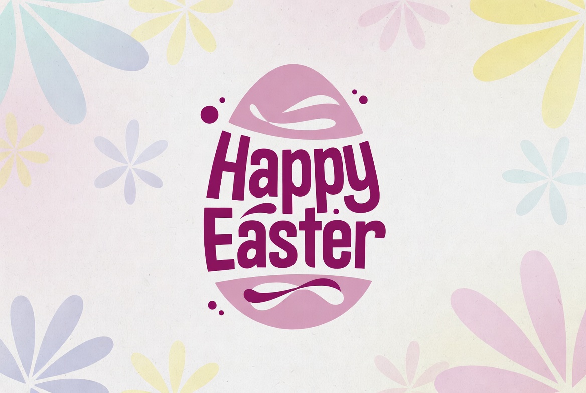 Easter clipart, Easter decoration, Easter egg, Easter greeting, blue flowers, festive design, flowers, holiday graphic, illustration, isolated background, pastel background, pink egg, pink flowers, purple text, spring flowers, vector art, yellow flowers, Happy Easter