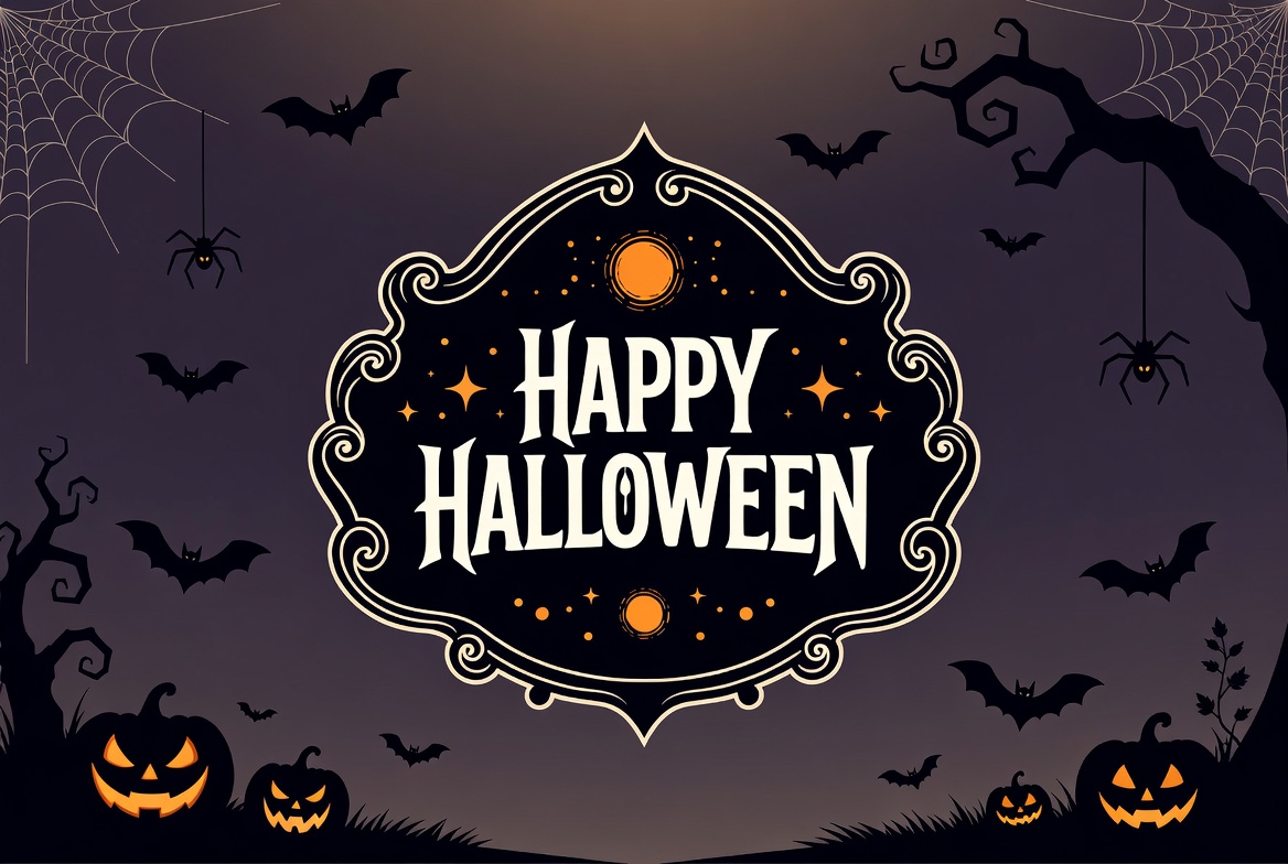 A vibrant Halloween illustration features a large ornate frame with 'Happy Halloween' text in the center. Surrounding elements include jack-o-lanterns, bats, spider webs, spiders, and twisted trees on a dark purple background. The design has glowing orange accents and starry details.
