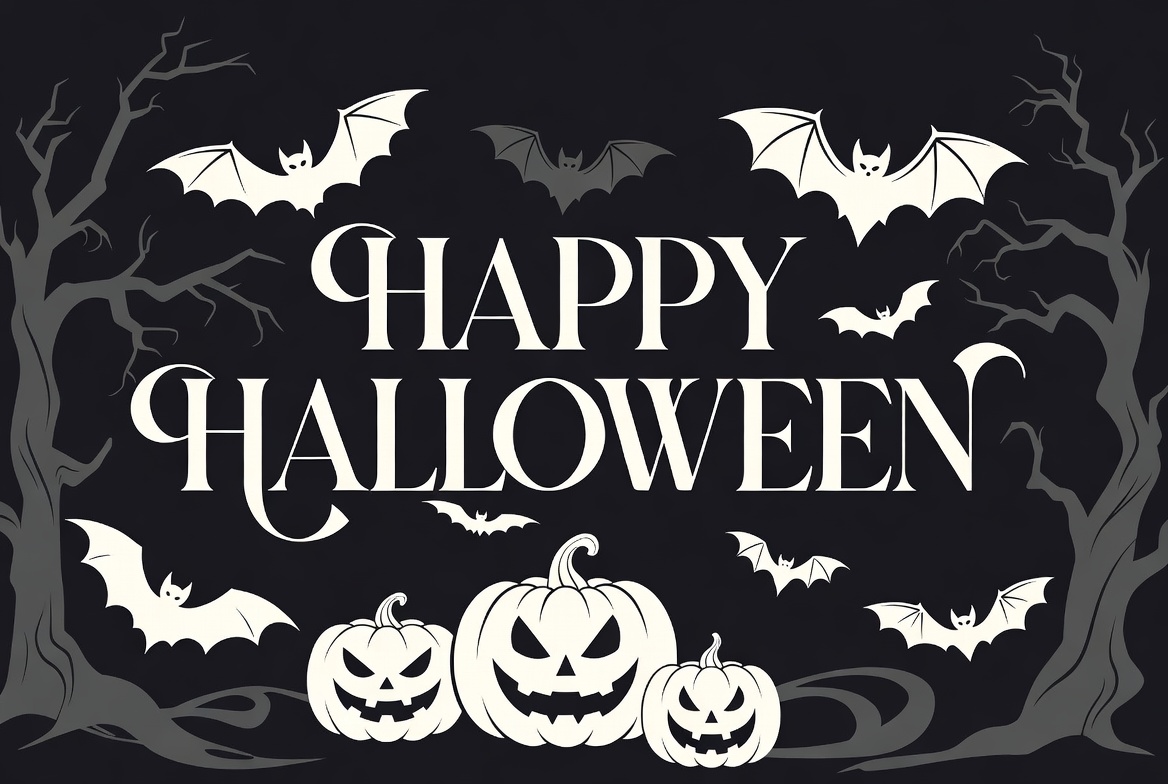 A black silhouette illustration features the text 'Happy Halloween' in large white letters. Flying bats and carved jack-o'-lantern pumpkins with scary faces surround the text. Twisted bare trees frame the spooky Halloween scene on a dark background.