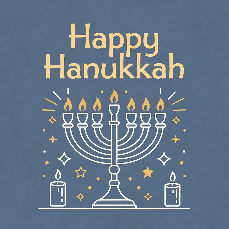 Hanukkah, Hanukkah menorah, Jewish holiday, blue background, candles, clipart, festive, gold candles, holiday greeting, illustration, isolated background, line art, lit candles, menorah, sparkles, stars, Happy Hanukkah