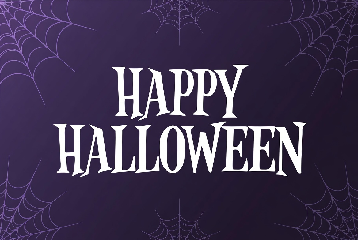 Halloween, Halloween card, October, banner, clipart, festive, gothic font, graphic design, holiday greeting, illustration, isolated background, pumpkin-free, purple background, purple gradient, spider webs, spooky, trick or treat, webs, white text, Happy Halloween