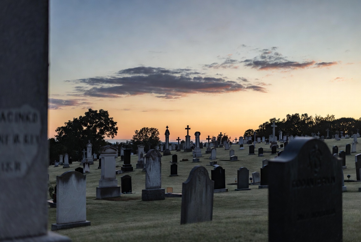 burial ground, clouds, crypts, dusk, field, foggy atmosphere, grass, gravestones, graveyard, headstones, mausoleum, memorials, monuments, orange sky, purple clouds, sky, sunset, tombstones, trees, cemetery