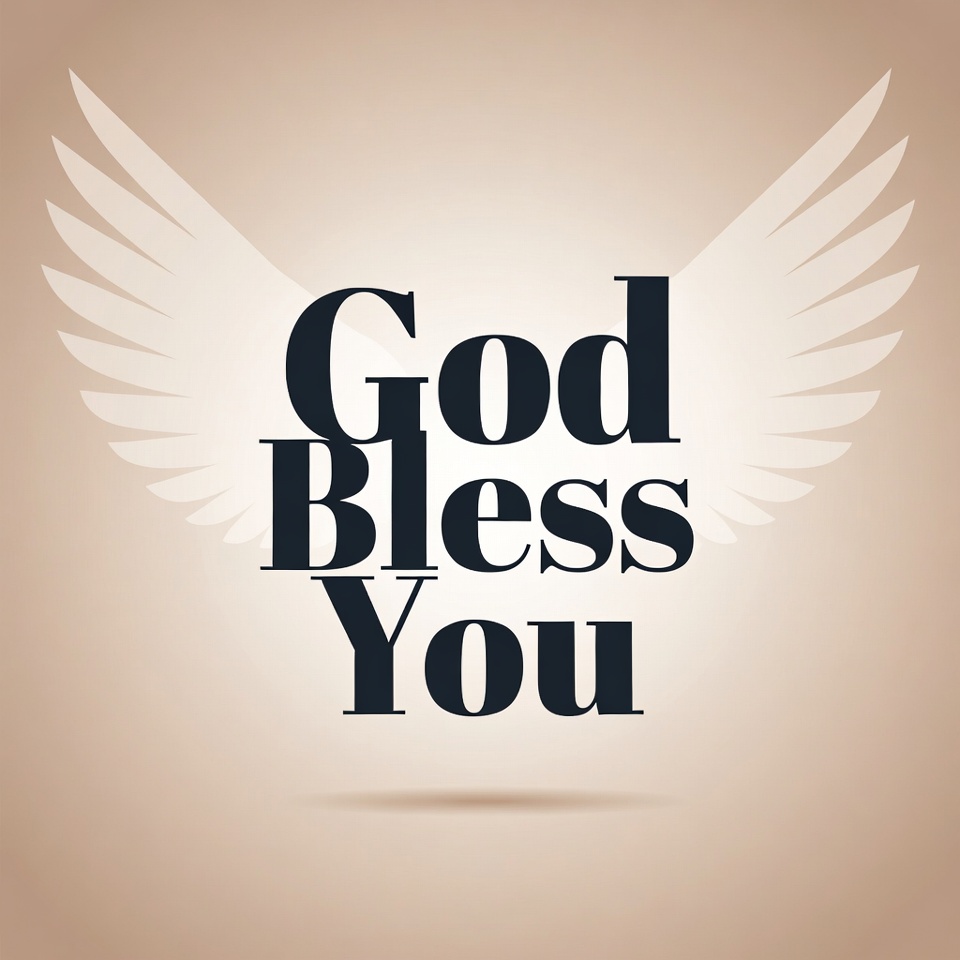 A digital illustration features the bold black text 'God Bless You' centered on a beige background. Large white angel wings extend from both sides of the text. A subtle shadow adds depth to the design.