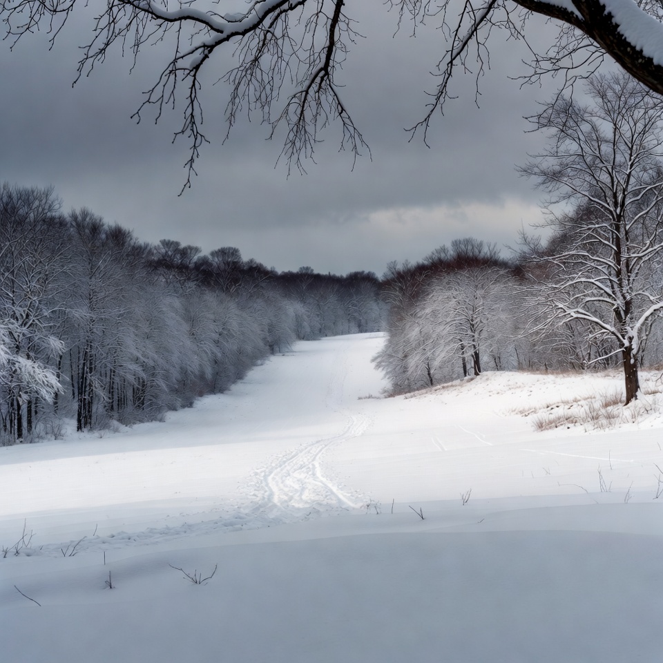 A snowy path winds through a dense forest of bare trees covered in snow. Dark gray clouds loom overhead, with overhanging branches framing the scene. Fresh snow tracks mark the trail leading into the distance.