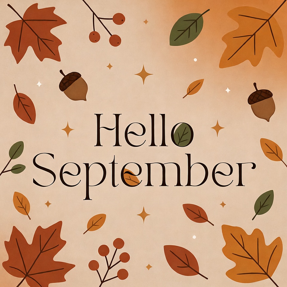 A vibrant digital illustration features the text 'Hello September' centered on a beige background. Surrounding elements include orange and green autumn leaves, acorns, red berries, and sparkling stars. The design captures fall foliage in a flat, graphic style.