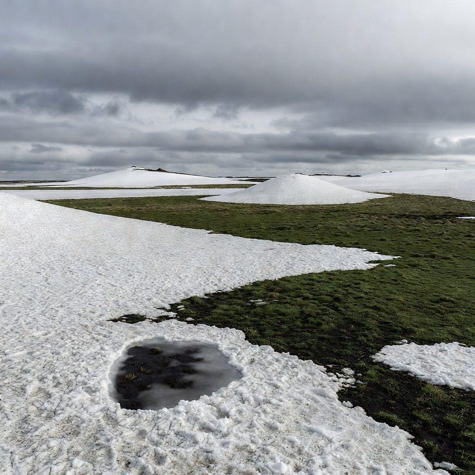 arctic terrain, cloudy sky, frozen puddle, grass patches, green grass, hills, icy ground, natural scenery, overcast sky, remote landscape, snow covered, snowy mounds, tundra, winter scenery, snowy landscape