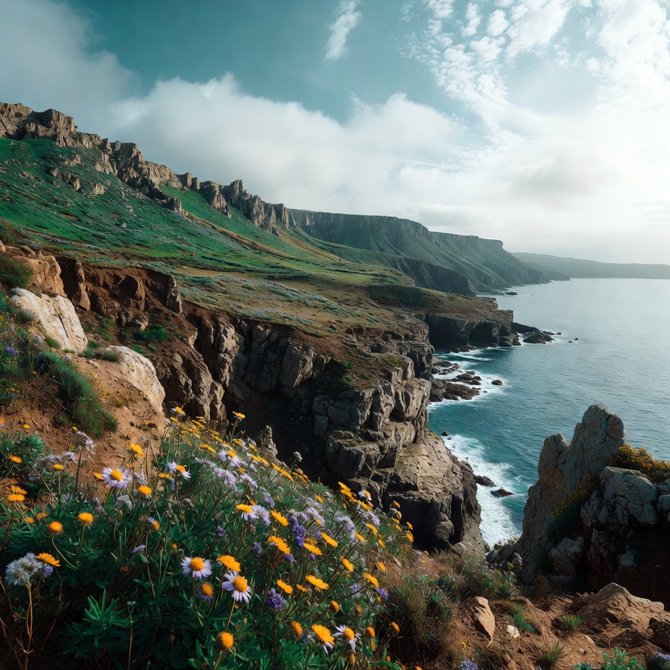 blooming flowers, blue sky, cliff edge, clouds, coastline, flowers, green hills, landscape, nature, ocean, outdoors, purple flowers, rocks, rugged cliffs, scenic, sea, waves, wildflowers, yellow flowers, cliffs
