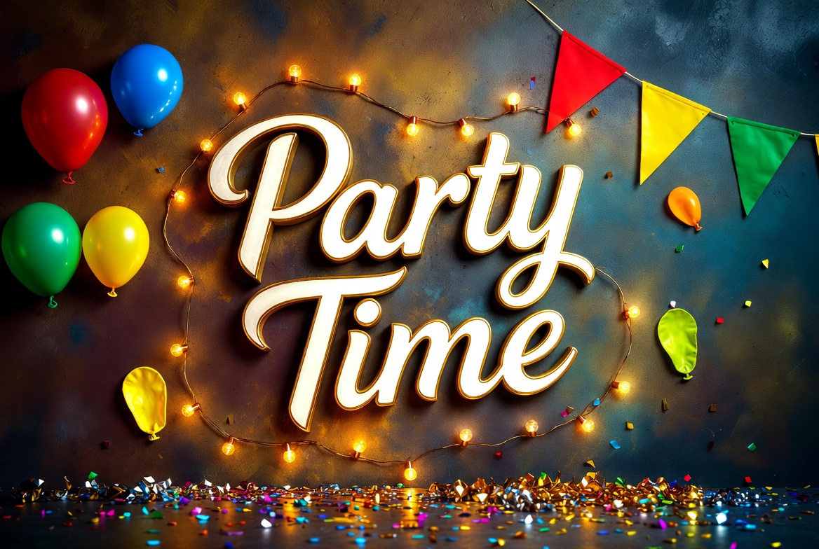 balloons, banners, blue balloon, celebration, colorful, confetti, decoration, event, festive, garland, gradient background, green balloon, holiday, invitation, isolated background, orange balloon, party, red balloon, shiny lights, signage, string lights, text, party time