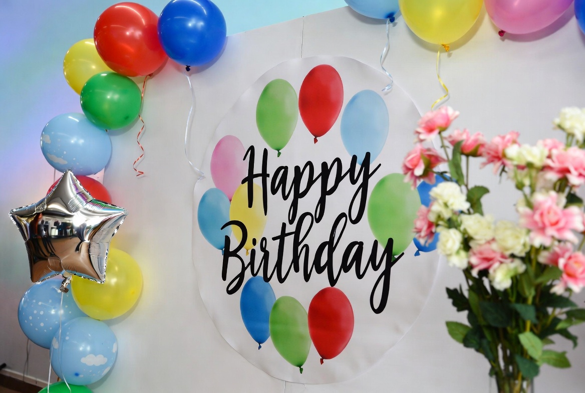 A large white circular sign displays 'Happy Birthday' in bold black script surrounded by colorful balloons. Multicolored balloons in red, blue, green, yellow, and pink are clustered around the sign and arched against a white backdrop. Pink roses and a silver star add decorative elements to the festive setup.