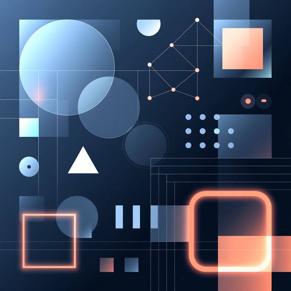 abstract art, blue circles, blue tones, dark blue, design elements, digital art, dots, futuristic, geometric pattern, geometric shapes, glowing lines, graphic elements, minimal design, modern design, neon orange, nodes, orange glow, overlapping shapes, rectangles, shapes pattern, squares, tech background, translucent, vector art, white triangle, abstract background
