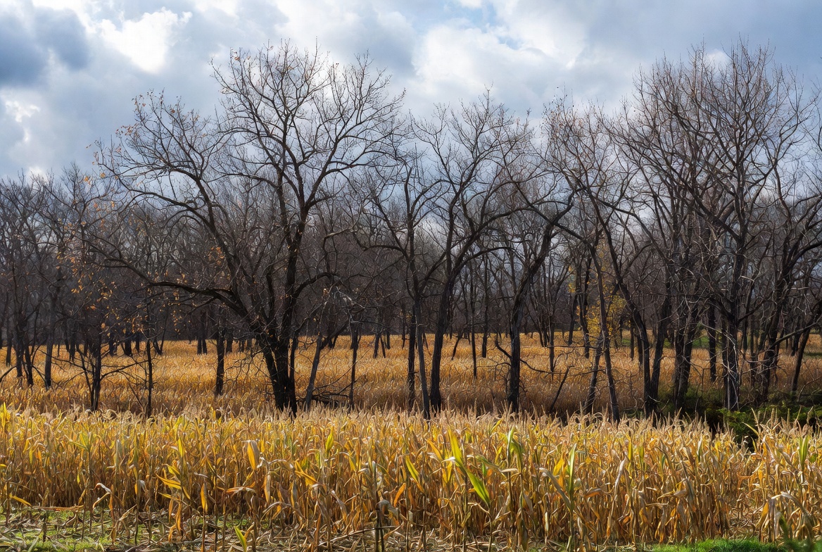 A field of tall golden corn stalks stretches towards a line of bare, leafless trees under a cloudy sky. The trees stand clustered with thin, twisted branches reaching upwards. Patches of autumn foliage add hints of color to the scene.
