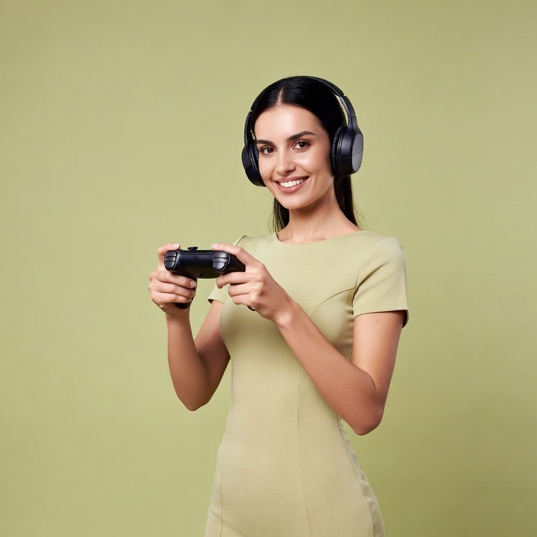 A smiling woman with long dark hair wears black headphones and holds a black PlayStation controller in both hands. She stands against a solid green background, dressed in a short-sleeved light green dress. Her expression shows enjoyment while focused on gaming.