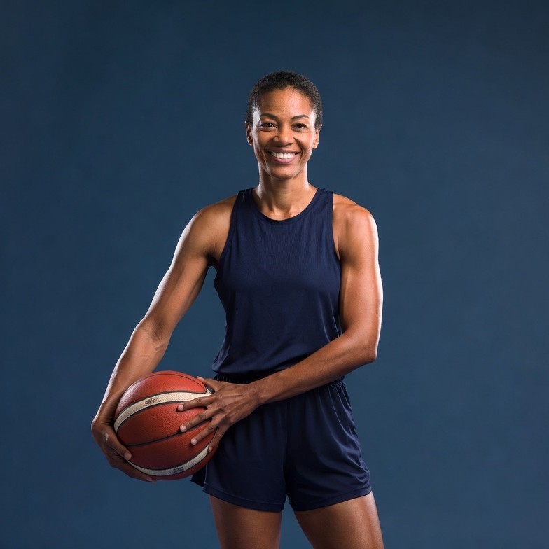 A smiling African-American woman with short hair stands confidently against a dark blue background. She wears a navy tank top and shorts, holding a red basketball with both hands. Her muscular arms and athletic build are prominent.