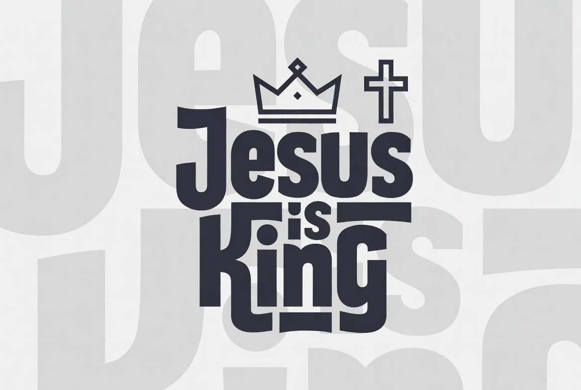 Bold graphic design features the text 'Jesus is King' in large, stylized black letters with gray shadows. A crown and cross adorn the top of the 'Jesus' text. The artwork is set against a plain white background.