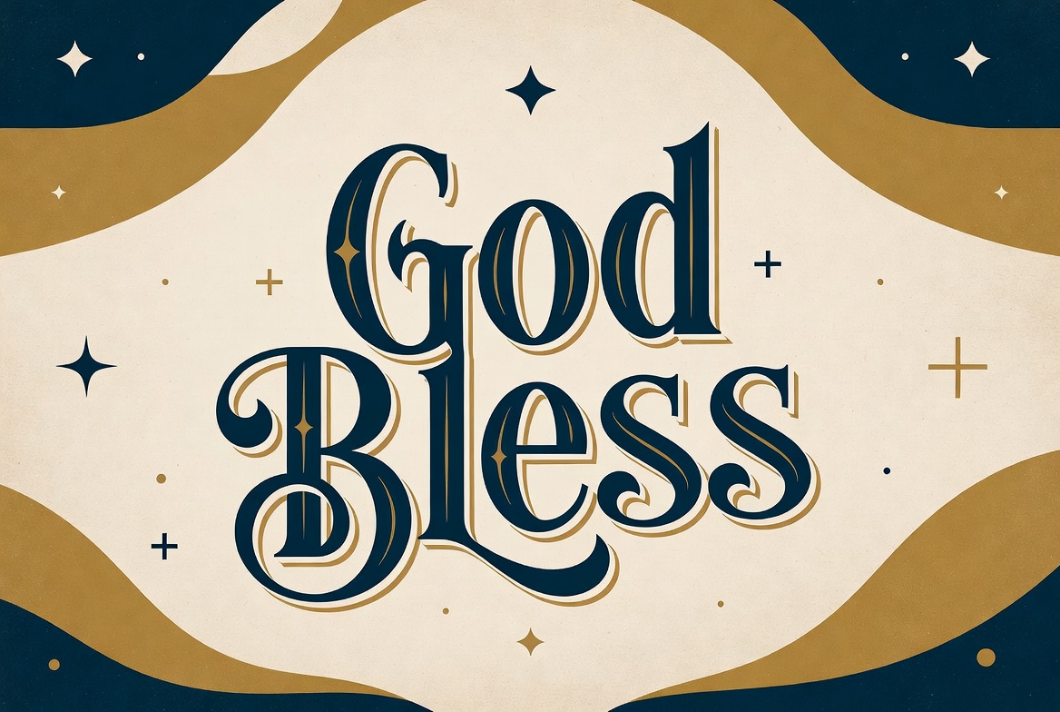 A decorative illustration features the text 'God Bless' in elegant gold cursive lettering. It is framed by wavy cream and navy borders with scattered stars and small crosses. The design has a vintage, celestial background.
